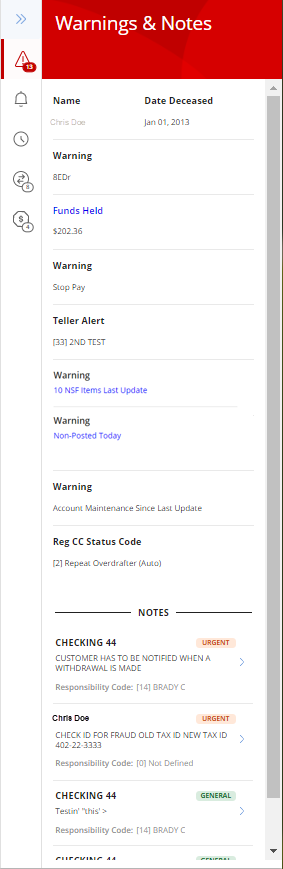 View system messages for customers and accounts as Warnings. For example, "10 NSF Items Last Update" appears as a link for you to view NSF Item details.